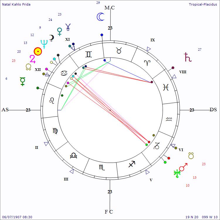 – Cet axe de signes se trouve dans les maisons V-XI, l’axe de la création. Mais on peut se poser la question de savoir si l’heure de naissance est tout à fait exacte, car cette configuration ultra violente aurait aussi, dans le cas de Frida Kahlo, été très probante sur l’axe VI-XII, des maladies, accidents et hôpitaux…