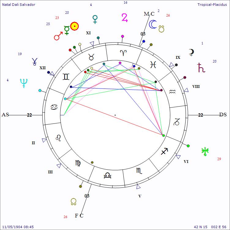 Comme dans le thème de Frida Kahlo, l’Ascendant Cancer est renforcé par la Lune culminante. Présence de sa femme Gala dans la plupart de ses peintures, Gala qui fut sa muse, et son meilleur agent artistique…