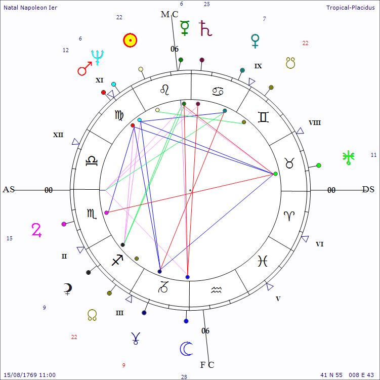 Conjonction Mars-Neptune reliée harmoniquement à Uranus et Pluton. Lui a permis les entreprises les plus extravagantes, mais a aussi causé sa perte, puisque Neptune (l’illusion) conjointe à Mars (l’action) lui aura fait perdre de vue les risques à s’engager dans la campagne de Russie.